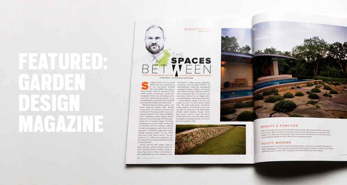 Hocker Design Group has been recognized by a variety of organizations and publications over the last few months. The list includes a Portfolio Series within Garden Design Magazine's Spring 2016 issue entitled "The Spaces Between" by Pam Penick.